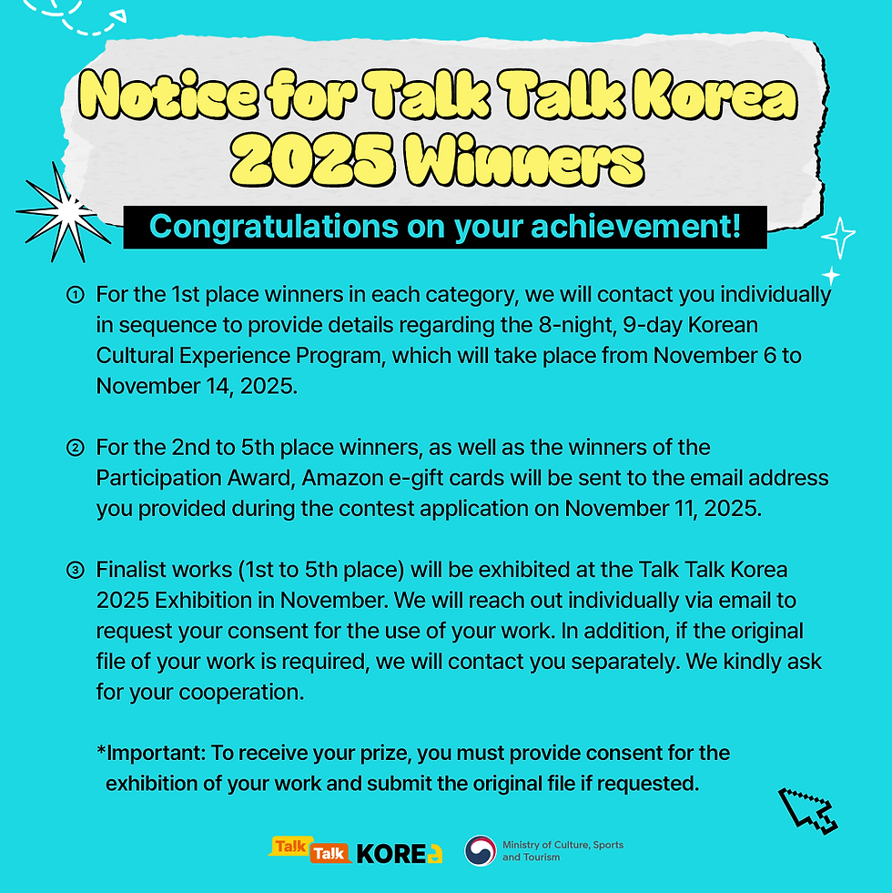 ① For the 1st place winners in each category, we will contact you individually in sequence to provide details regarding the 8-night, 9-day Korean Cultural Experience Program, which will take place from November 6 to November 14, 2025.